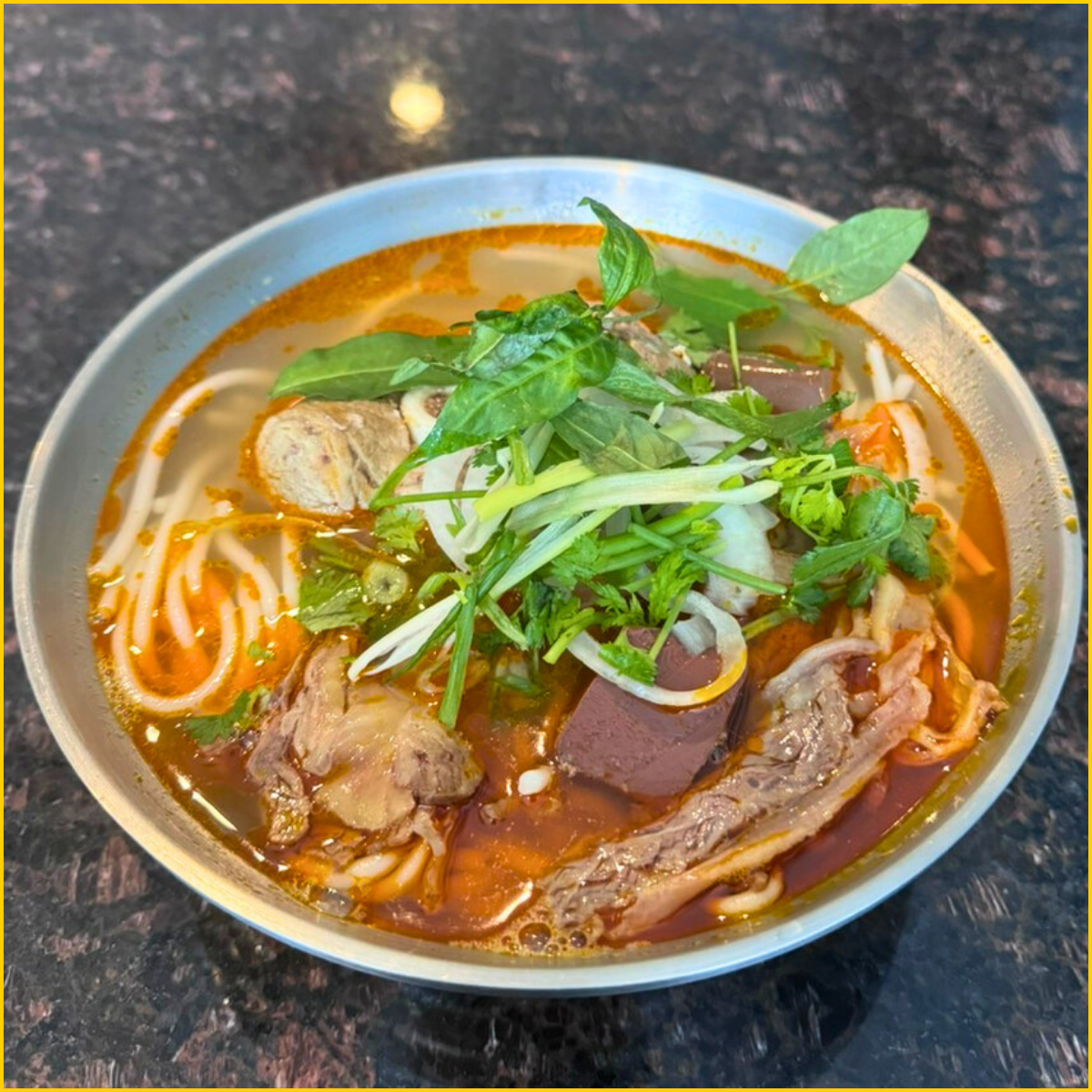 Central Vietnam’s (Hue) Style Beef Noodle Soup -Topped with sliced onions, scallion, cilantro, sliced beef, congealed pork blood, pig’s trotters, and Vietnamese ham, served with mixed vegetables and lime on the side