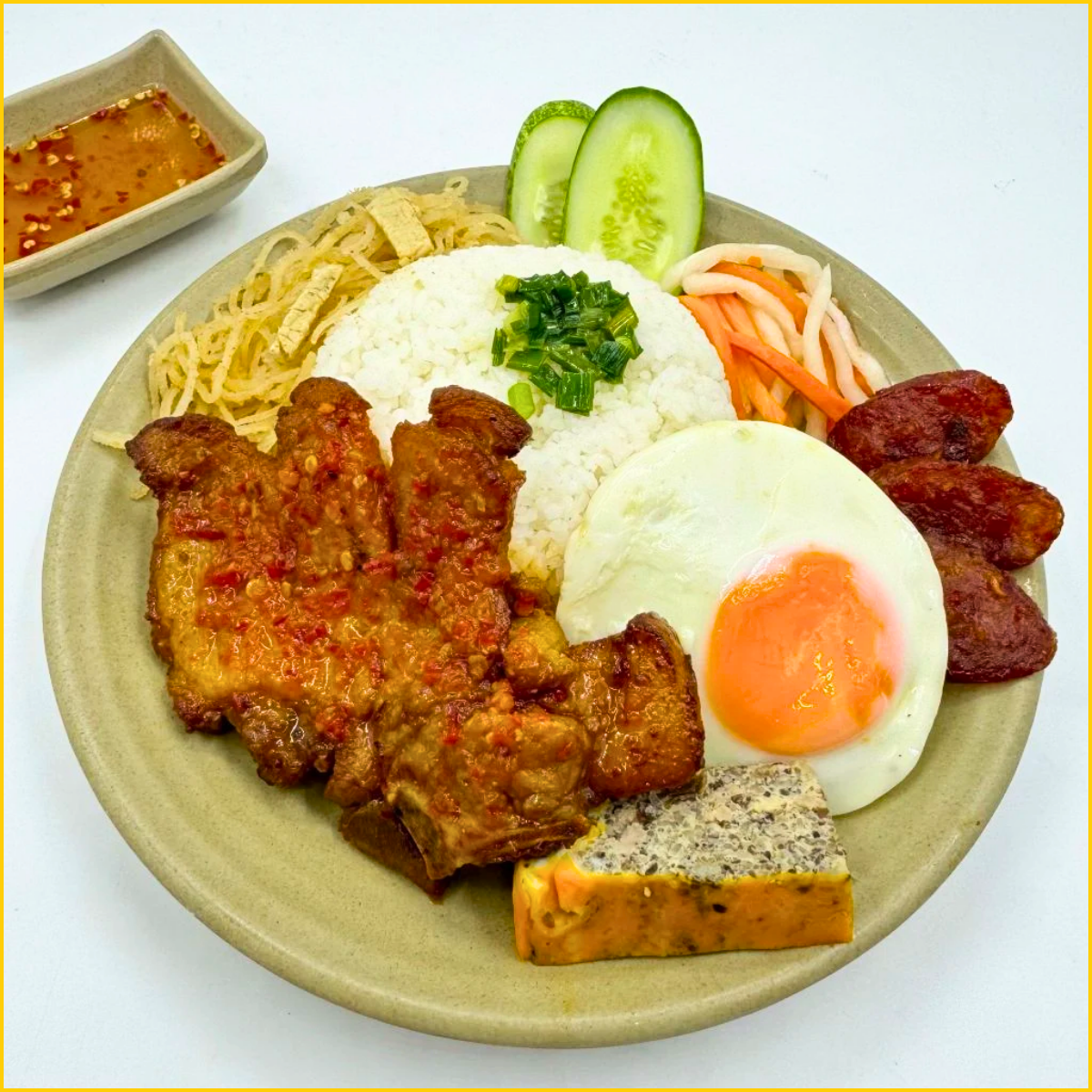 Broken Rice with grilled Pork chop, Shredded Pork skin, Egg custard and fried egg - Size Small: 1 topping - Size Larger: 2 Topping - Size X - larger: 3 Topping