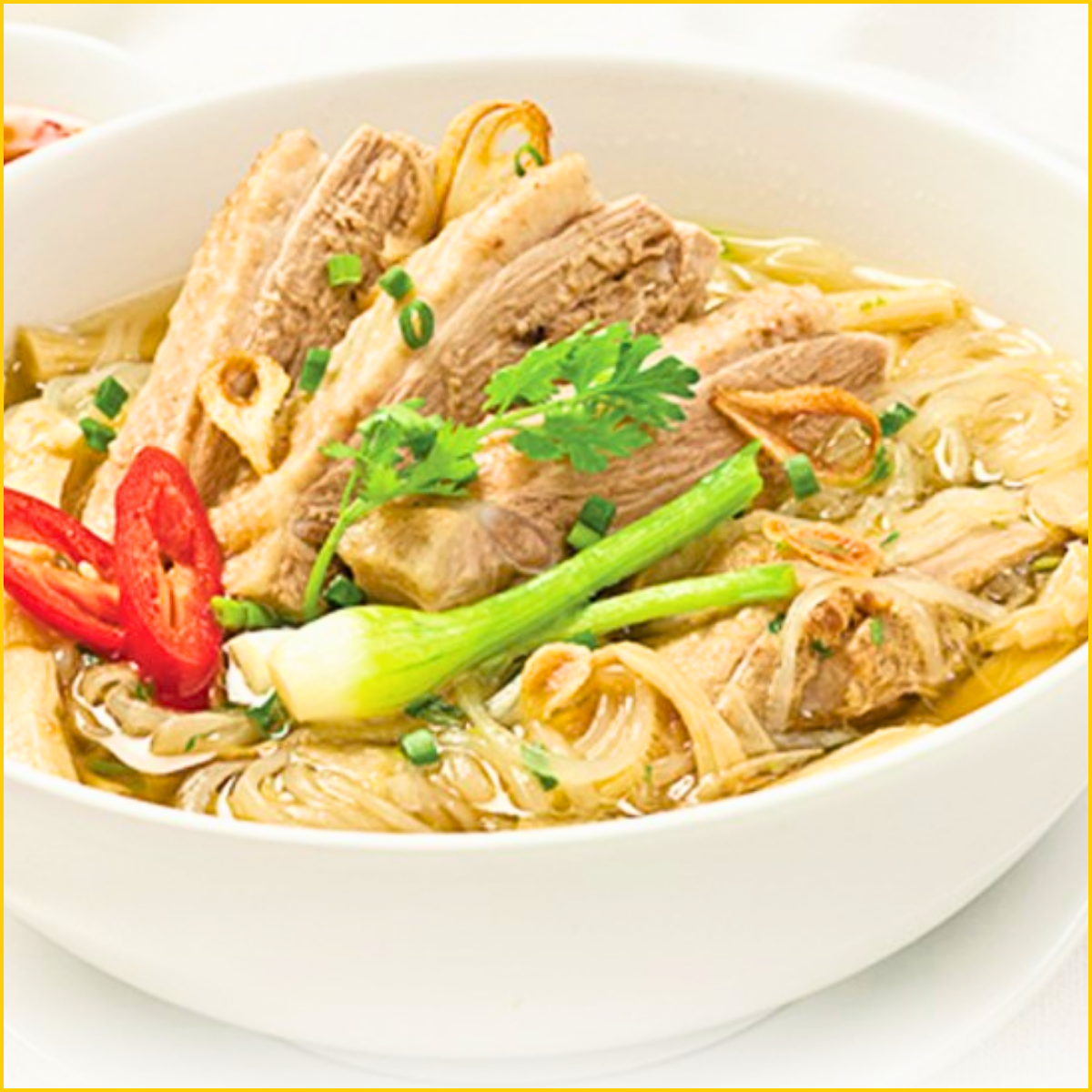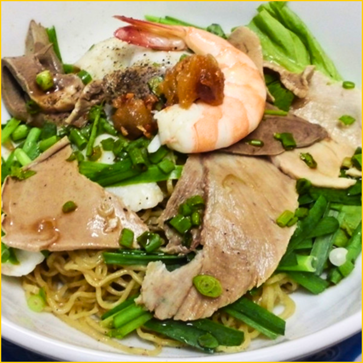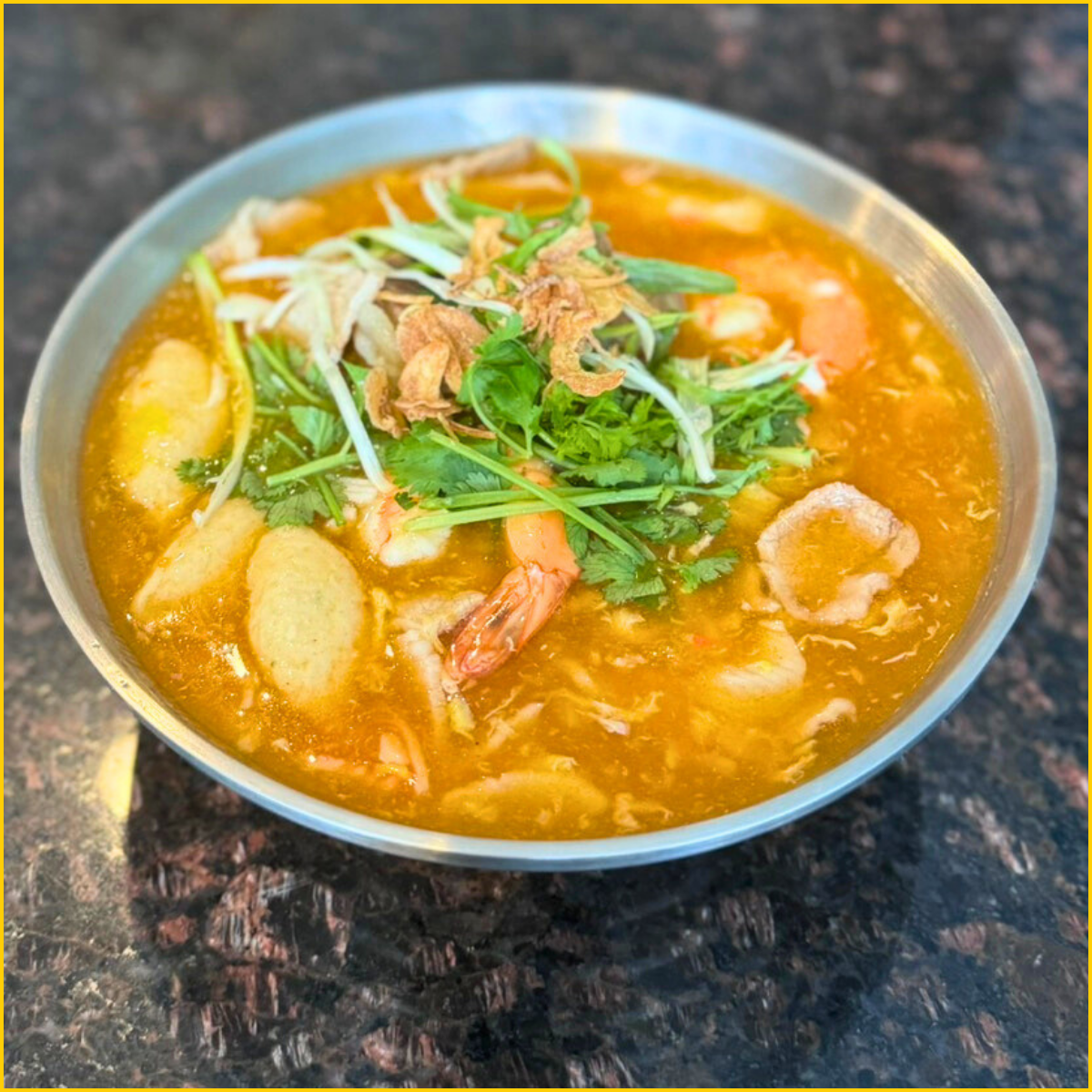 Special Noodle Soup(Soup/Dry) - topped with sliced pork, shrimp, squid, imitation crab meat, pork liver, and fish cake, served with bean sprouts and lime on the side and a choice of yellow noodle or rice noodle