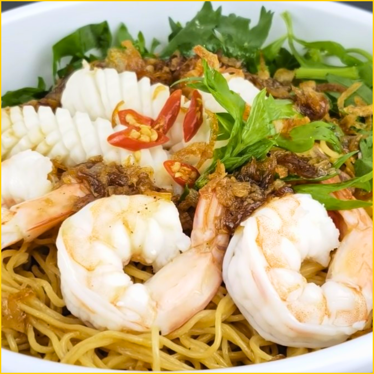 Seafood Noodle Soup (Soup/Dry) - topped with shrimp, squid, imitation crabmeat, fish cake, served with bean sprouts and lime on the side. A choice of rice noodle or yellow noodle