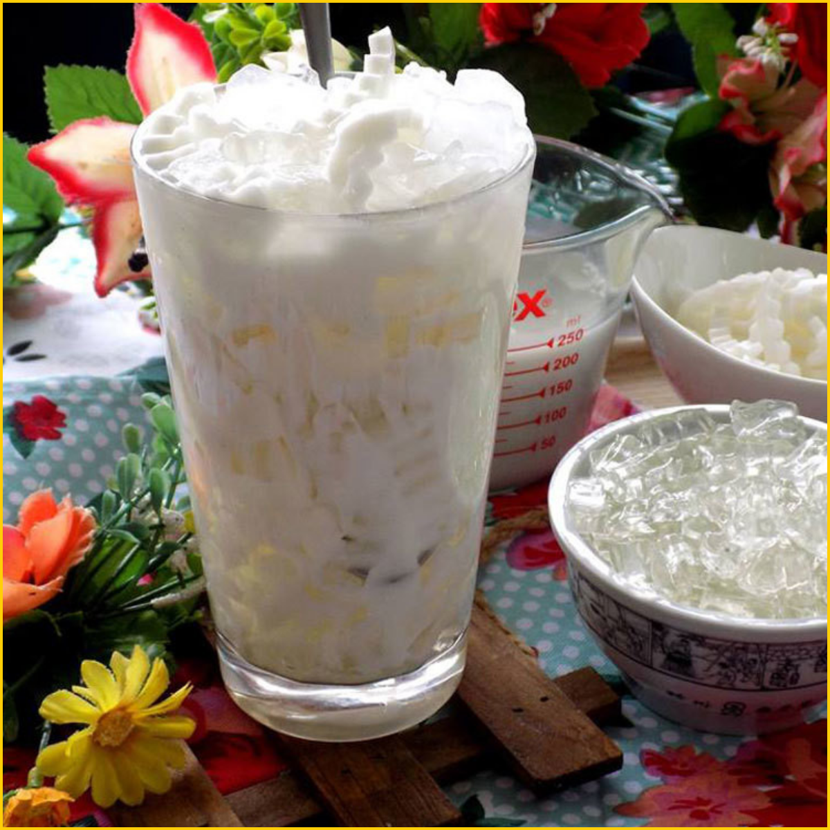 Three color dessert: A mixture of worm-like jelly, red bean, green bean, coconut milk and topped with peanuts.