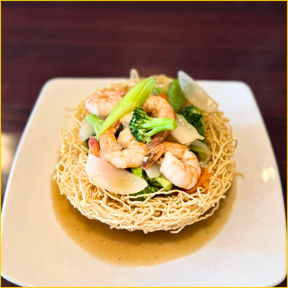 Crispy Yellow noodle stir-fried with vegetable medley and tofu